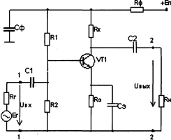 Усиливаемый сигнал от источника сигнала в базовую цепь транзистора подается через разделительный конденсатор С1. Сопротивление Rк