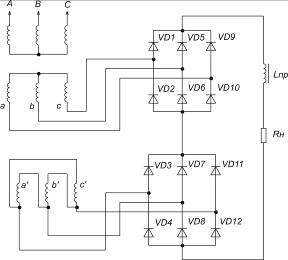 В схеме имеется 2 системы вторичных обмоток, одна включена звездой, др.- треугольником. В схеме действует 12 импульсов тока за период.