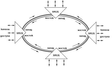 Топология "кольцо" (рис.1) широко используется для построения SDH сетей первых двух уровней SDH иерархии (155 и 622 Мбит/с). Основное преимущество этой топологии - лёгкость организации защиты типа 1+1, благодаря наличию в синхронных мультиплексорах SMUX двух пар оптических каналов приёма/передачи: восток - запад, дающих возможность формирования двойного кольца со встречными потоками.