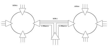 Другое часто используемое в архитектуре сетей SDH решение - соединение типа "кольцо-кольцо". Кольца в этом соединении могут быть либо одинакового, либо разного уровней иерархии SDH. На рис.2.2 показана схема соединения двух колец одного уровня - STM-4, а на рис.3.13 каскадная схема соединения трёх колец - STM-1, STM-4, STM-16.