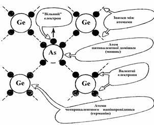 Описане явище провідності в напівпровідниках має місце лише в чистих матеріалах. Що ж зміниться, коли в чистий напівпровідник потрапить атом, який має на орбіті не чотири електрони, а п'ять?