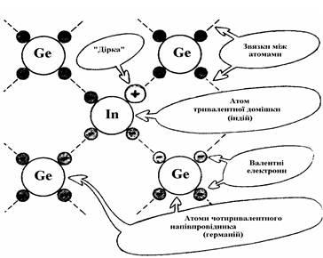 Уявимо собі іншу картину: в чистий напівпровідник введено домішку атом якої, на зовнішній орбіті, має три електрони (рис.7).