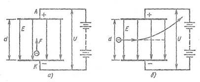 Для з'ясування фізичних процесів розглянемо рух електрона в однорідному електричному полі. Уявимо собі, що в балоні, в якому створений вакуум, розташовані два взаємно паралельних електроду - катод К