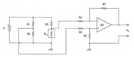 ), що легований деякими металами (платина, мідь, нікель, паладій), кожний з яких підвищує чутливість до конкретного газу. При нагріванні до 400°С за допомогою нагрівача на поверхні оксиду олова має місце адсорбція кисню, яка залежить від газу домішки. Тому змінюється електрична провідність датчика. Такий датчик включають у резистивний міст по схемі рис.34. Щоб компенсувати температурну залежність датчика, у такий міст включають також термістор Rt.