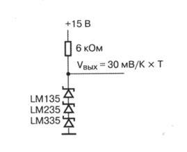 Ці датчики являють собою стабілітрони, у яких напруга стабілізації залежить від температури з коефіцієнтом 10 мВ/°K. Еквівалентний стабілітрон має динамічний опір менший за 1 Ом і працює в діапазонах температур від -55 до +150°С. Для таких мікросхем, як LM135, LM235, LM335 похибка вимірювань складає менша за 1°С. Схема включення мікросхем такого типу показана на рис.31.