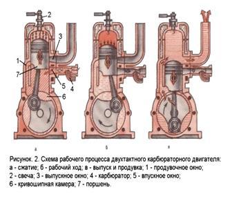 Рабочий цикл двухтактного карбюраторного Двигателя внутреннего сгорания осуществляется за два хода поршня или за один оборот коленчатого вала. Процессы сжатия, сгорания и расширения практически аналогичны соответствующим процессам четырёхтактного.