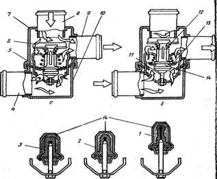 При температуре охлаждающей жидкости ниже 80°С основной клапан полностью закрыт, а перепускной открыт (рис. 8, а), поэтому жидкость из радиатора в насос не поступает, а циркулирует по малому кругу: от центробежного насоса в рубашку охлаждения и через перепускной клапан обратно к насосу, что обеспечивает более быстрый прогрев двигателя. По мере нагрева охлаждающей жидкости церезин в термостате плавится и, расширяясь, преодолевает сопротивление пружины 13,