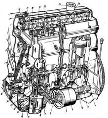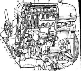 поступает в верхний бачок радиатора. Одновременно часть нагретой жидкости проходит через рубашку впускного трубопровода двигателя, подогревая горючую смесь; при необходимости жидкость может отводиться с помощью крана в отопитель салона кузова. Проходя через сердцевину радиатора в его нижний бачок, нагретая жидкость охлаждается и снова поступает к центробежному насосу.