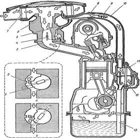 отвода картерных газов непосредственно с за дроссельным пространством карбюратора. Разрежение в за дроссельном пространстве при этом падает, а на входе в карбюратор, наоборот, возрастает и основная часть картерных газов проходит через корпус воздушного фильтра, за счет чего увеличивается интенсивность вентиляции картера с возрастанием нагрузки на двигатель.