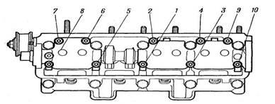 Для автомобиля ВАЗ после пробега первых 2000...3000 км, а также, при появлении признаков прорыва газов или подтекания охлаждающей жидкости в соединении подтянуть гайки шпилек и болты крепления головки блока цилиндров. Одновременно подтянуть винты (болты) крепления поддона картера. Проверить и при необходимости подтянуть болты (гайки) крепления опор двигателя, очистить от грязи и масла резиновые подушки. На автомобиле ВАЗ-2106 кроме указанных работ подтянуть гайки крепления крышек распределительного вала моментом 2,2 кгс*м в последовательности, показанной на рис. 11.
