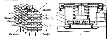 Рис. 6. Сердцевина (а) и пробка (б)радиатора: 1 — трубки; 2— стальные пластины; 3— выпускной клапан; 4— впускной клапан; 5 - горловина радиатора; 6 —корпус пробки; 7—патрубок к расширительному бачку.