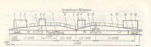 1-передняя тележка; 2- будка машинного отделения; 3, 6, 11, 16-щетки: рельсовая, шпальные, шпально-рельсовые; 4-дозатор; 5-пульт управления дозатором; 7-четырехосная тележка; 8-направляющая ферма; 9-междуферменный шарнир; 10 – центральный пульт управления; 12 – механизм подъема и сдвига пути с электромагнитами; 13 – балластерная рама; 14 – рабочая ферма; 15- компрессор; 17 – задняя двухосная тележка; 18 - хозяйственная будка