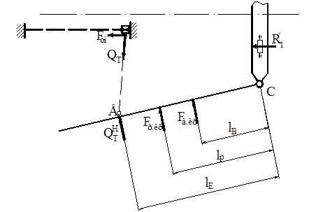 Для расчета силы все силы резания балласта и от призмы волочения, действующие на части крыла при работе, проектируют на горизонтальную плоскость и приводят к двум силам и . Составляют уравнение суммы моментов этих сил относительно шарнира, соединяющего щит и крыло, и определяют составляющую усилия , действующую в узле Е перпендикулярно плоскости крыла.