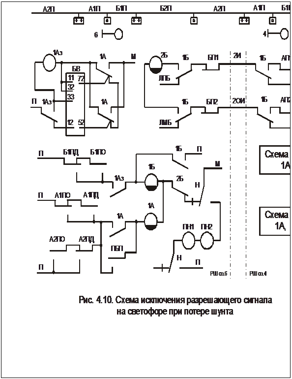 3. Работа схемы исключения разрешающего сигнала на светофоре при потере шунта организована с использованием линейных проводов 2Б - 2ОБ, в которые на переезде введены контакты реле 2АБ1, 2АБ2.