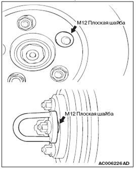 При использовании навесной шлифовальной машинки: вначале на шпильки ступицы колеса установите плоские шайбы М12, так как показано на рисунке, после чего установите адаптер шлифовальной машинки. Если установить адаптер без шайб М12, то вследствие неточности при шлифовании, тормозной диск может быть деформирован.