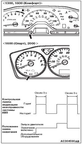 1. При установке замка зажигания в положение"ON" - ЗАЖИГАНИЕ ВКЛЮЧЕНО, контрольная лампа индикации неисправности системы ABS горит в течении около 3 секунд, после чего автоматически гаснет.