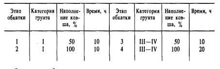 Екскаватор ЭО-6122. Обкатування машин виробляється з різними навантаженнями під спостереженням механіка протягом 50 ч (див. табл. 9). Перевіряють обертання гідронасосів короткочасним їхнім включенням. Потім запускають електродвигун і працюють у неодруженому режимі гідронасосів 1 ч, прослухуючи їхню роботу. Якщо температура робочої рідини в гідробаці підвищиться понад 50°С, то включають вентилятор маслоохладителя. При виявленні підвищеного (нехарактерного) шуму або стукоту, течі робочої рідини виключають електродвигуни, виявляють несправності й усувають них. Після того як переконаються в нормальній роботі гідронасосів на неодруженому ходу, приступають до обкатування механізмів екскаватора. Обкатування в неодруженому режимі і під навантаженням проводять по тим же правилам і в тих же обсягах, як і екскаваторів ЭО-5123.
