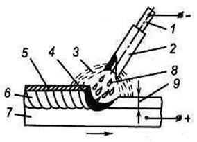 (стрелкой указано направление сварки): 1 - металлический стержень; 2 - покрытие электрода; 3 - газовая атмосфера дуги; 4 - сварочная ванна; 5 - затвердевший шлак; 6 - закристаллизовавшийся металл шва; 7 - основной металл; 8 - капли расплавленного электродного металла; 9 – глубина проплавления