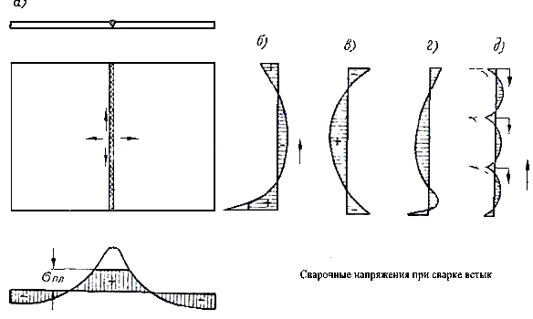 В процессе наложения шва остывающий металл производит на ранее наплавленную часть воздействия внецентренного сжатия, а сам подвергается стягиванию последующим наплавленным металлом ("Сварочные напряжения при сварке встык", эпюра на рис. Б). Свариваемые встык полосы изгибаются при сварке выпуклостью внутрь (рис. слева); при остывании полосы стремиться разогнуться и принять форму выпуклостью наружу, отчего возникают поперечные напряжения: растягивающие - в средней части шва и сжимающие - по краям ("Сварочные напряжения при сварке встык", рис. В).