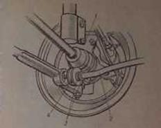 шарнира стабилизатора и уступом на самом стабилитроне 2. Перед регулировкой необходимо отсоединить стабилизатор от места его крепления к поперечине передней опоры двигателя, отвернуть гайку и извлечь конец стабилизатора из проушины рычага. Регулировочная шайба толщиной 3 мм (конструктивно предусмотрено две шайбы) изменяет угол примерно на 20'. Соотношение углов поворота регулируют обычно взаимным изменением длин боковых тяг - одну укорачивают, другую на такую же величину удлиняют. Несоблюдение этого условия вызовет изменение угла схождения.