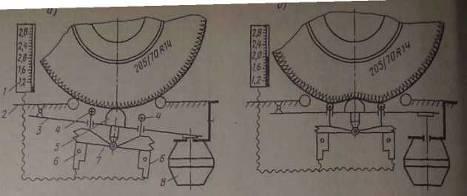 При движении заднеприводного автомобиля под действием сил дорожного сопротивления передние колеса расходятся (у переднеприводных автомобилей в тяговом режиме, как правило, сходятся) на величину существующих зазоров в рулевой трапеции и становятся параллельно друг другу. Нормативное схождение не всегда обеспечивает это условие. Причина — в индивидуальном техническом состоянии каждого автомобиля, особенно с независимой подвеской передних колес. Этот недостаток устраним применением нового способа регулировки угла схождения легковых автомобилей при нагружении их силами, имитирующими условия движения: вертикальной силон ил передний мост (500—600 Н) и разжимной силой на передние колеса между боковинами передних шин на уровне центров колес. Разжимную силу определим по номограмме (рис. 1.2.3) с учетом фактического развала а,