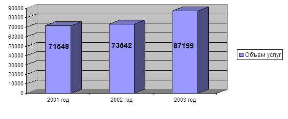 8. Объём услуг СП ИЛПП ООО «ИлимСибЛес» за 2001-2003 годы увеличился на 6,01%. Среднегодовой темп роста составил 2,96%. Коэффициент выполнения плана по объему услуг в целом по предприятию за 2003 год в стоимостном выражении составил 0,933, в натуральном выражении 0,914, что свидетельствует о невыполнении плана по объему услуг.