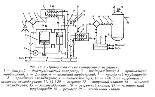 Принципову схему компресорної установки (рис. 1) з одним поршневим двоступеневим компресором (при потребі їх можна встановити кілька) показано на рис. 1. Робота цієї установки здійснюється таким чином. Повітря з навколишнього середовищі надходить у повітрозбірник 3, звідки через фільтр 5 подається в циліндр ступеня стискання компресора 2.