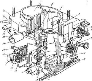 Карбюратор (рис. 1) через теплоизолирующую прокладку устанавливается на впускной газопровод с помощью четырех шпилек с гайками. Он состоит из двух базовых деталей: корпуса 17 и крышки 24, в которой имеются входные горловины / смесительных камер и колодцы для прохода воздуха к двум главным воздушным жиклерам 2. В горловине первой камеры установлена воздушная заслонка 3, а с боковой стороны крышки крепится пусковое устройство с регулировочным винтом 6, пружиной и мембраной 5 в сборе со штоком. В резьбовом канале крышки крепится электромагнитный клапан 20 и топливный жиклер 21 системы холостого хода. Для подачи в карбюратор топлива и слива его излишков в крышке 24 установлены соответственно патрубки 22 и 23.