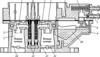Совместно с корпусом 17 отливаются большие диффузоры, в которые вставляются малые диффузоры 19, отлитые заодно с их распылителями. Внутри корпуса размещается поплавковая камера с топливными каналами и установлен распылитель 4 ускорительного насоса. Основная рабочая полость ускорительного насоса размещена в приливе корпуса, к которому крепится крышка с рычагом 12 привода и мембраной 14. Привод ускорительного насоса осуществляется от кулачка 13, установленного на оси дроссельной заслонки 10 первой камеры. К приливу корпуса, образующему рабочую полость с жиклером 15, крепится крышка 16 экономайзера мошностных режимов с мембраной 18, на которой закреплена игла, воздействующая на шариковый клапан.