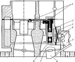 Ускорительный насос (рис. 5) служит для кратковременного обогащения горючей смеси в режиме ускорения (разгона) автомобиля. Особенностью его устройства является наличие распылителей / в каждой смесительной камере. Ускорительный насос — мембранного типа с приводом от кулачка 6, расположенного на оси дроссельной заслонки 7. Производительность насоса не регулируется, а зависит только от профиля кулачка 6. При резком открытии дроссельной заслонки 7 кулачок 6 перемещает рычаг 5 и через толкатель 4 нажимает на мембрану 3, преодолевая сопротивление возвратной пружины. Мембрана через колодец ускорительного насоса, шариковый клапан 2 и распылители / подает топливо в первую и вторую смесительные камеры, тем самым обогащая горючую смесь. При возвращении мембраны в исходное положение топливо из поплавковой камеры засасывается через обратный шариковый клапан 8 и поступает в рабочую полость ускорительного насоса.