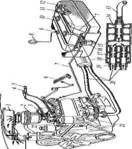 В системе питания карбюраторного двигателя (рис. 1) бензин из бака 10 через открытый кран 12, фильтр-отстойник 16 и топливопроводы 7 подается насосом 22 к карбюратору 3. Одновременно из подкапотного пространства или канала / через воздухоочиститель 2 в карбюратор засасывается очищенный воздух, который, смешиваясь с парами и мелкораспыленными частицами бензина, образует горючую смесь, поступающую через впускной газопровод в цилиндры двигателя. Из цилиндров отработавшие газы через выпускной газопровод 21 отводятся в приемные трубы 20, из них — к глушителю 18, который не только снижает шум, но и гасит пламя и искры от отработавших газов при выходе их через выпускную трубу 13. Глушитель грузового автомобиля представляет собой цилиндрический корпус, который перегородками 15 разделен на ряд полостей и имеет переднее 19 и заднее 14 днища с патрубками и три внутренние грубы 17со щелевидными отверстиями.