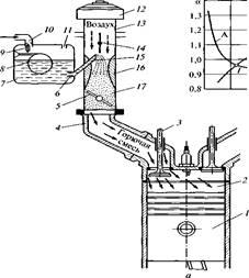 Под действием разности давлений в смесительной 17 и поплавковой 7 камерах топливо вытекает из распылителя и из-за большой скорости воздуха интенсивно размельчается, затем, испаряясь, смешивается с воздухом, образуя паровоздушную горючую смесь. Количество и качество горючей смеси, поступающей в цилиндры двигателя, регулируют изменением положения дроссельной заслонки.