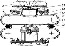 Пневмобаллоны являются не только упругим элементом, но и выполняют роль гасителя колебаний. Пневмобаллоны состоят из резинокордной оболочки 26 (рис. 10, 6) с бандажным кольцом 28. Внутри баллона на кронштейне закреплен резиновый буфер 27 — ограничитель хода сжатия подвески, упирающийся при работе в опорную пяту 25. Нижней частью пневмобаллон соединяется с кронштейном балки моста, а верхней — с фланцем дополнительного воздушного резервуара 2 через демпфирующее устройство. Последнее состоит из корпуса 23, установленного в опоре 24, шайбы 21 и клапана 22, которые стянуты между собой болтом 19 и гайкой 20. Демпфирующее устройство в сборе поджимается опорной пятой 25 буфера сжатия и через отверстие 18 сообщается с внутренней полостью дополнительного резервуара 2.