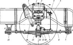 В подвеску включены два телескопических гидравлических амортизатора 14, которые верхними головками соединены через резиновые втулки с кронштейнами кузова, нижними — с балкой переднего моста.