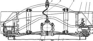 В подвеске установлены четыре телескопических гидравлических амортизатора 3, соединенные с кронштейнами основания кузова и опорных балок через резиновые втулки. Ограничительные резиновые буфера 1 хода отдачи закреплены на балке основания кузова и при помощи тросов 2 с наконечниками, имеющими резиновые втулки, соединены с кронштейнами крепления балки 11 моста.