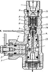 При уменьшении статической нагрузки на пол кузова расстояние между основанием кузова и балкой моста увеличивается, рычаг З с валом 2 поворачивается в обратную сторону, а эксцентрик 16 опускает шток /5 вниз. При этом верхний конец штока отходит от клапана 5 и полость А регулятора через отверстие в штоке и фильтре сообщается с атмосферой. Давление в пневмобаллонах падает, и пол кузова опускается в исходное положение, после чего шток регулятора и рычаг 3 устанавливаются в среднее (нейтральное) положение, и выпуск воздуха из пневмобаллонов прекращается.