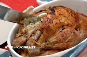 Тушку курицы фаршируют отварным рисом с размельченным кизилом, солью и пассерованным на масле луком, зашивают и жарят над углями.