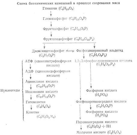 В течении первых суток после убоя развитие посмертного окоченения приводит к снижению рН от 6,5-7,0 до 5,5-5,6 отсутствию выраженных вкуса и аромата. В связи с отсутствием поступления кислорода в организм ресинтеза гликогена в мясе после убоя не происходит и начинается его анаэробный распад, который протекает по пути фосфоролиза и амилолиза с образованием молочной кислоты и глюкозы. Это коррелирует с изменением рН и АТФ.