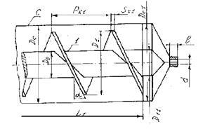 Шнек прессующего механизма имеет на своей поверхности винтовые канавки, разделенные лопастями. (рисунок 2). Для повышения технологичности шнек иногда выполняют составным из участков с разным шагом и высотой лопасти. Толщина лопасти шнека должна находиться в определенных пределах. Тонкие лопасти приводят к возрастанию утечек между шнеком и цилиндром, а толстые лопасти увеличивают потребляемую мощность привода. Возможен перегрев материала, попадающего в зазор между цилиндром и лопастью шнека. Уменьшение диаметра шнека позволяет с одной стороны облегчить заполнение прессующего механизма прессуемым материалом, а с другой стороны, как показывает практика, увеличить давление прессования.