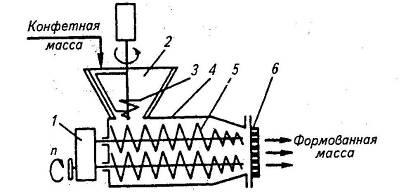 Двухшнековый формовочный пресс используется в производстве конфет, в частности пралине, методом формования конфетной массы через фильеру с калиброванными отверстиями. В производстве макарон, лапши применяют одношнековые и двухшнековые прессы. Пресс создает давление конфетной массе из жгуты конфетной массе и продавливает ее через фильеру. Непосредственно на выходе массы из фильеры жгуты конфетной массы рубятся на гранулы эксцентрично установленными ножами гранулятора. Фильера представляет собой плоский металлический диск с отверстиями, через которые продавливается прессуемая масса. Форма отверстия фильеры определяет вид изделия. При продавливании через отверстия фильеры масса принимает определенную форму. Течение массы в отверстиях фильеры подобно течению очень вязкой жидкости.