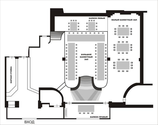 При оформленні залу важливо врахувати розташування банкетних столів, при розстановці яких враховують площу залу, його конфігурацію, кількість учасників банкета, розташування дверей і вікон. Довжина столу визначається з розрахунку 0,8 м. на одного почесного гостя, 0,6 м - на решту учасників банкета