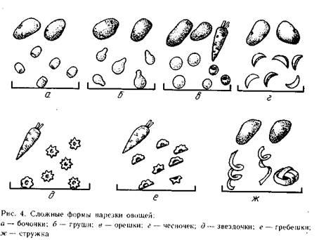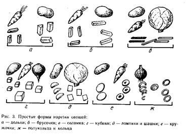 Правильное положение рук при нарезке овощей и основные формы их нарезки показаны на рисунках 1—4.