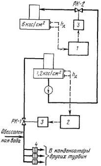 ограничивающим подачу обессоленной воды в линию основного конденсата турбины, получающим импульс Δр по перепаду на последнем подогревателе низкого давления. Регуляторы 3