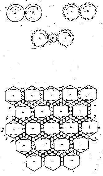Рис.4 Максвелл устраняет взаимодействие вращающихся в одну сторону соседних вихрей А и В, вводя между ними «холостые шестеренки»