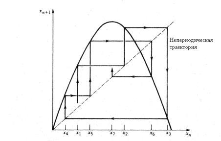 , можуть виникати хаотичні ітерації, тобто поведінка моделі на великих часах не укладається в рамки простого періодичного руху. У інтервалі _:< _ < 4 також присутні певні вузькі інтервали s_, для яких існують періодичні орбіти. Хаотична орбіта логістичного відображення показана на мал. 2 за допомогою залежності х n+1