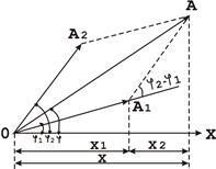 З точки 0, вибрані на вісі Х, під кутами (початкова фаза першого коливання) і (початкова фаза другого коливання) відкладаємо модуль амплітуд і (Рис.1).