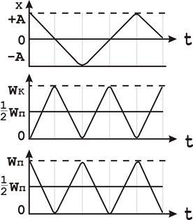 Потенціальна енергія змінюється як і кінетична енергія, з частотою і в тиж же межах від 0 до , але зі зсувом фаз відносно кінетичної енергії на p.