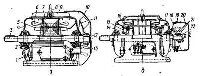 а — з короткозамкненим ротором; б — з фазним ротором; 1 — підшипниковий щит; 2, 13 — підшипники; 3 — вал; 4 — вікно для перевірки щупом зазору між сталлю статора і ротора; 5 — вентиляційна лопать на роторі; 6.— обмотка статора; 7 — осердя статора; 8 — підйомне кільце (рим); 9 — ребро станини; 10 — захисний кожух; 11 — вентилятор; 12 — отвори для всмоктування повітря вентилятором; 14 — тримач обмотки; 15 — диск кріплення балансувального вантажу; 16 — обмотка фазного ротора; 17 — вивід кінців роторної обмотки до контактних кілець; 18 — чашка; 19 — замок; 20 — ковпак; 21 — контактні кільця; 22 — втулка, що ізолює контактні кільця від вала.