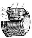 1 — корпус; 2 — болт; 3 — натискне кільце; 4 — міканітова прокладка: 5 — «півник»; 6 — «ластівчин хвіст»; 7 — колекторна пластина
