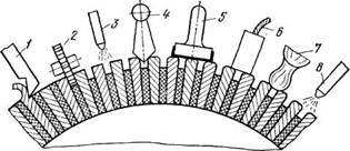 1 - обточування, 2 - продорожуваніє, 3,8 - продування стислим повітрям, 4 - зняття фасок, 5 - шліфовка і поліровка, 6 - притирання щіток, 7 - чищення дрантям